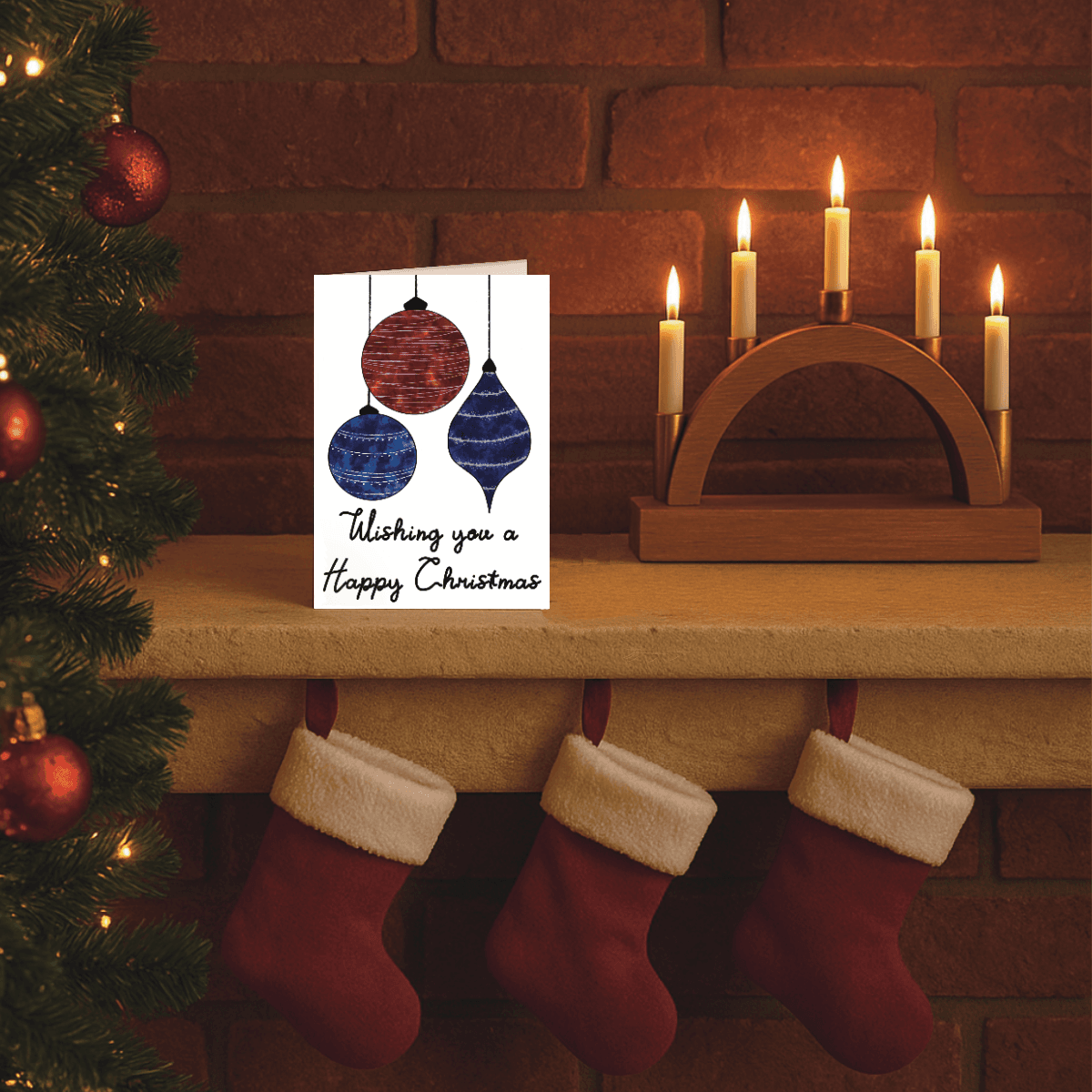 Three beautifully illustrated baubles in rich red, deep navy blue and dark purple hang gracefully across this elegant card, each decorated with hand-drawn glitter effects that catch the eye. The warm message “wishing you a happy christmas” is written in a friendly script beneath these festive ornaments, creating a card that’s both stylish and heartfelt.