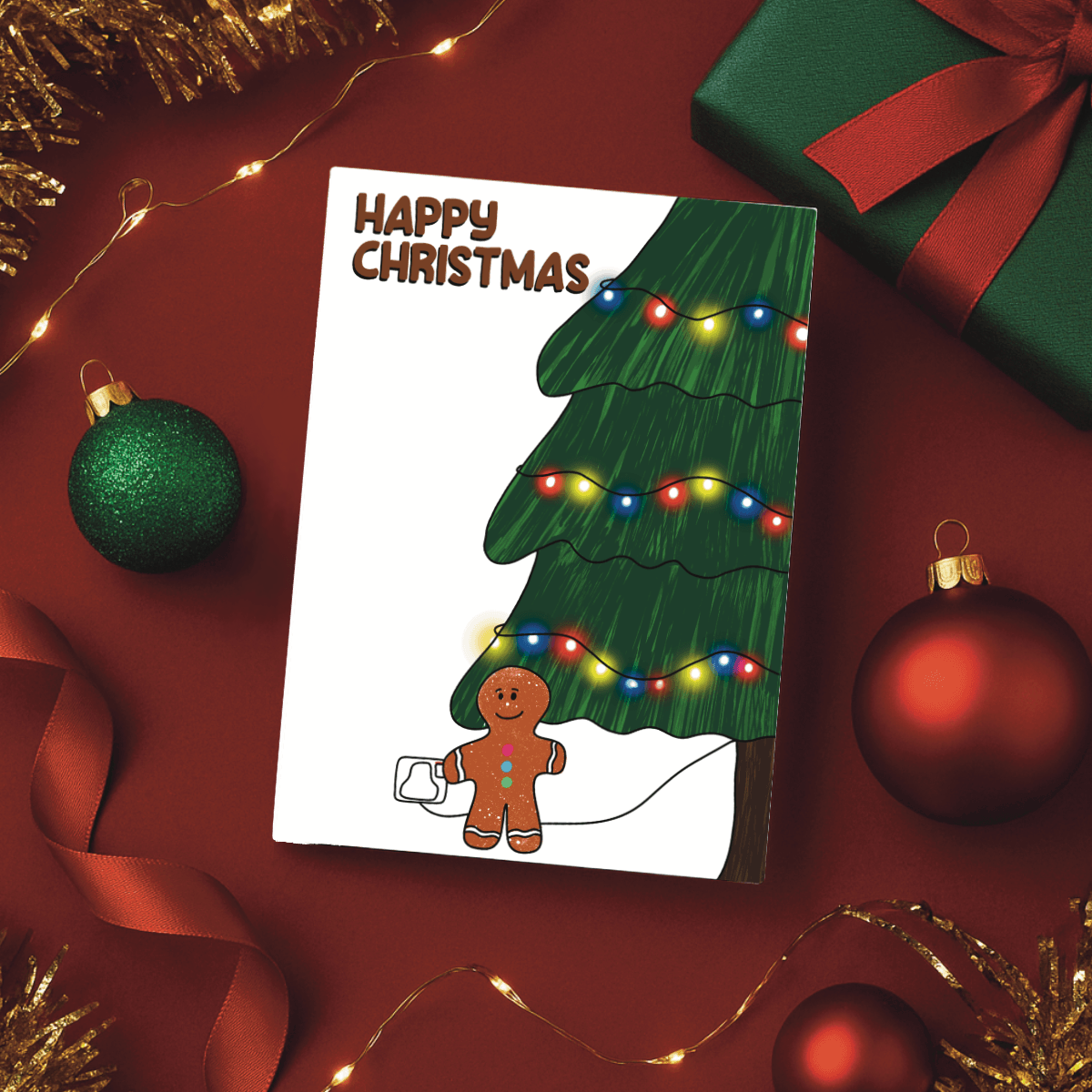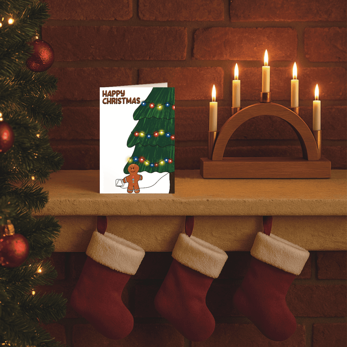 A delightful gingerbread man with his classic iced smile has just flicked the switch to light up a beautifully decorated Christmas tree, complete with baubles and a golden star on top. The cheerful “happy christmas” greeting at the top perfectly captures this magical moment when the tree comes to life, bringing joy and wonder to the festive season.