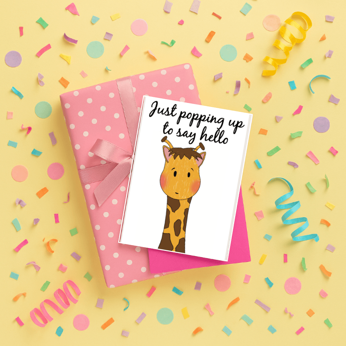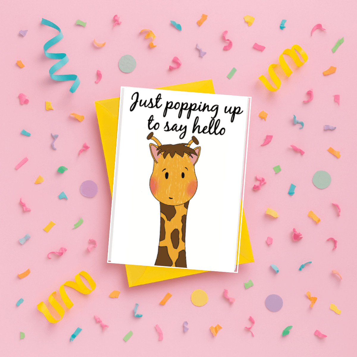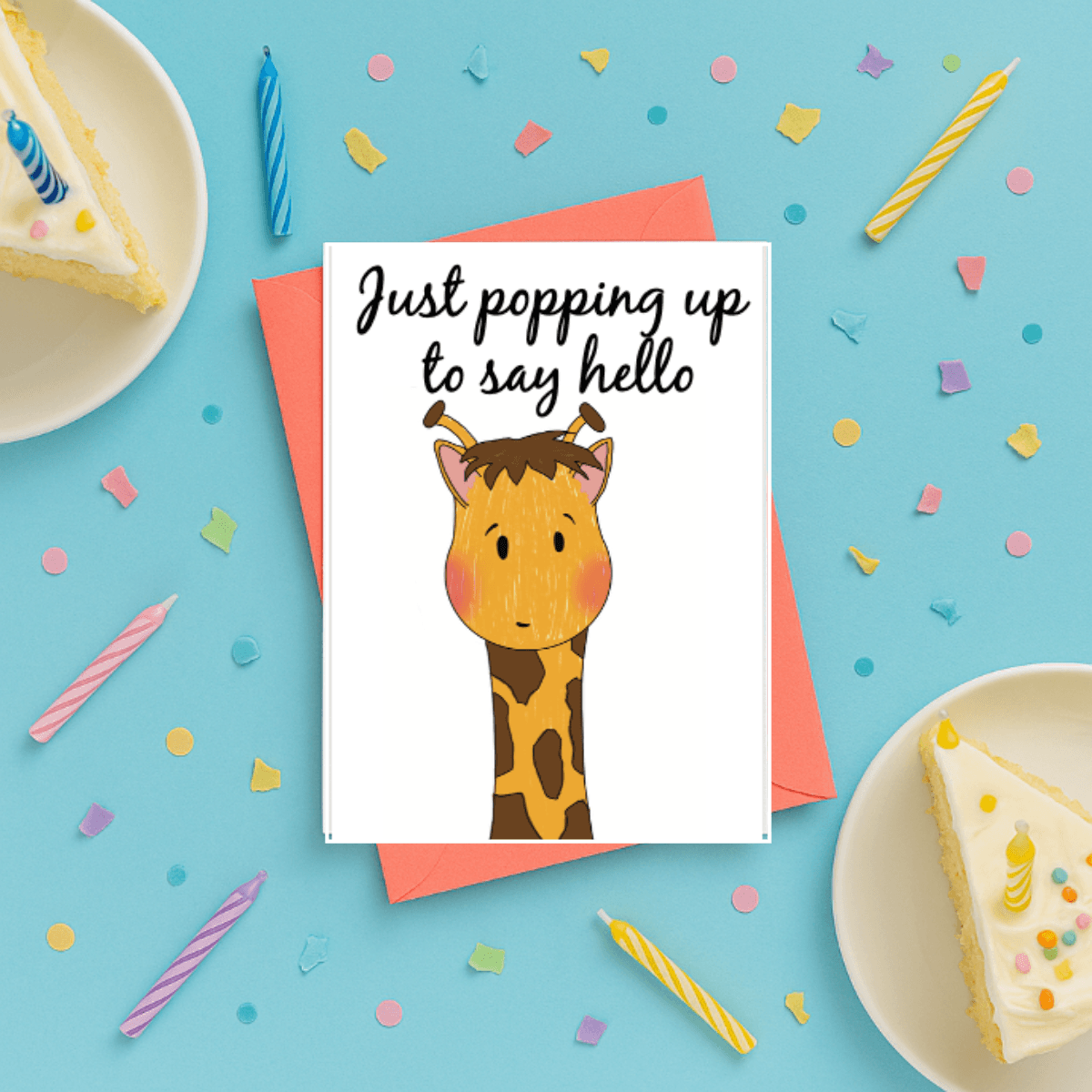 This giraffe note card features an adorable giraffe popping up from the bottom of the card with the friendly text “just poppin up to say hello.” A charming blank greeting card perfect for staying in touch, sending a quick note, or simply brightening someone’s day. The playful giraffe design with its long neck perfectly illustrates the “popping up” concept. I can send card for me directly to your recipient at no extra cost, making it easy to surprise friends and family. Ideal for casual hellos, thinking of you messages, or any time you want to reach out with a smile.