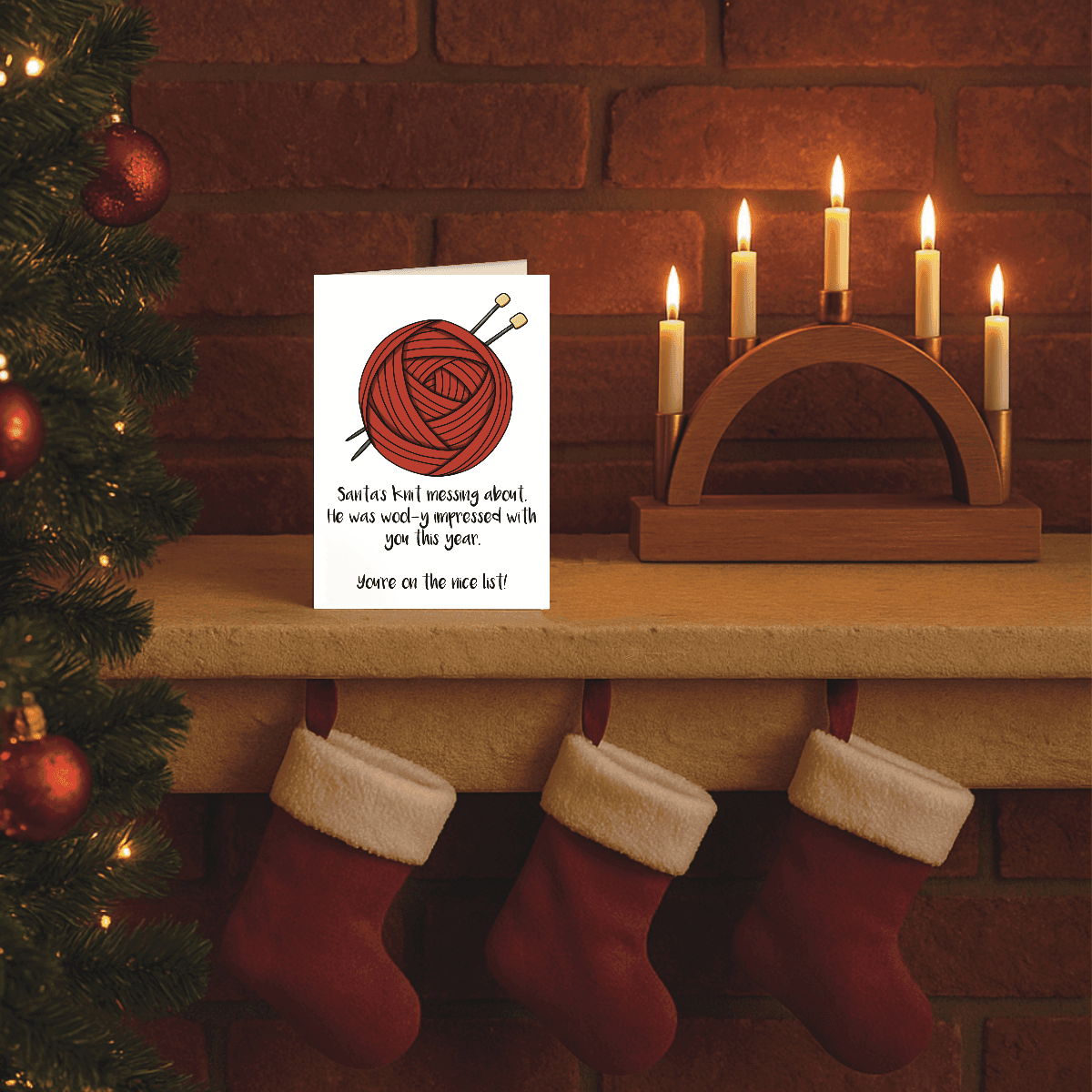 A cheerful ball of bright red yarn sits ready with knitting needles crossed through it, accompanied by the absolutely brilliant pun: “santa’s knit messing about. he was wool-y impressed with you this year. you’re on the nice list!” This card is perfect for your crafty friends, knitting circle buddies, or anyone who appreciates a good yarn-related joke during the festive season.