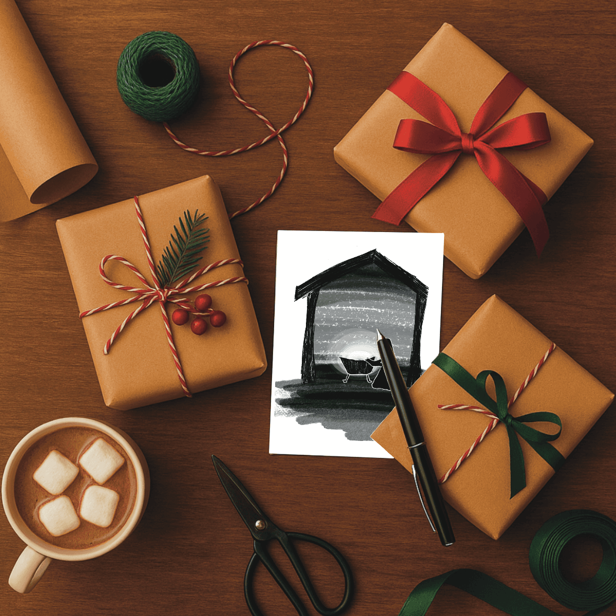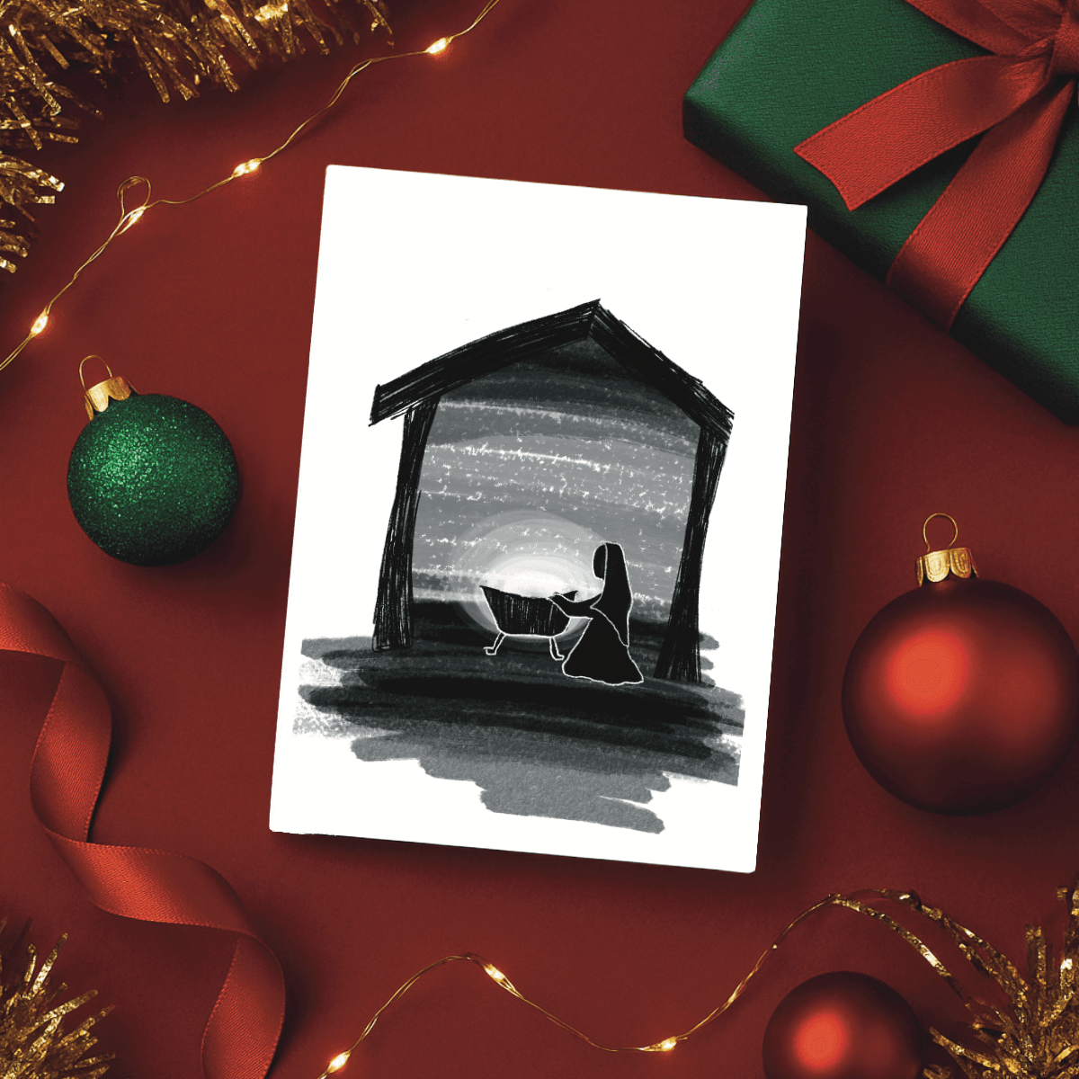 A beautifully simple and elegant silhouette captures the heart of Christmas – Mary kneeling reverently beside the manger crib. Rendered entirely in classic black against white, this traditional design focuses on the true meaning of the season with dignity and grace. Perfect for those who appreciate a more reverent and understated approach to Christmas cards.