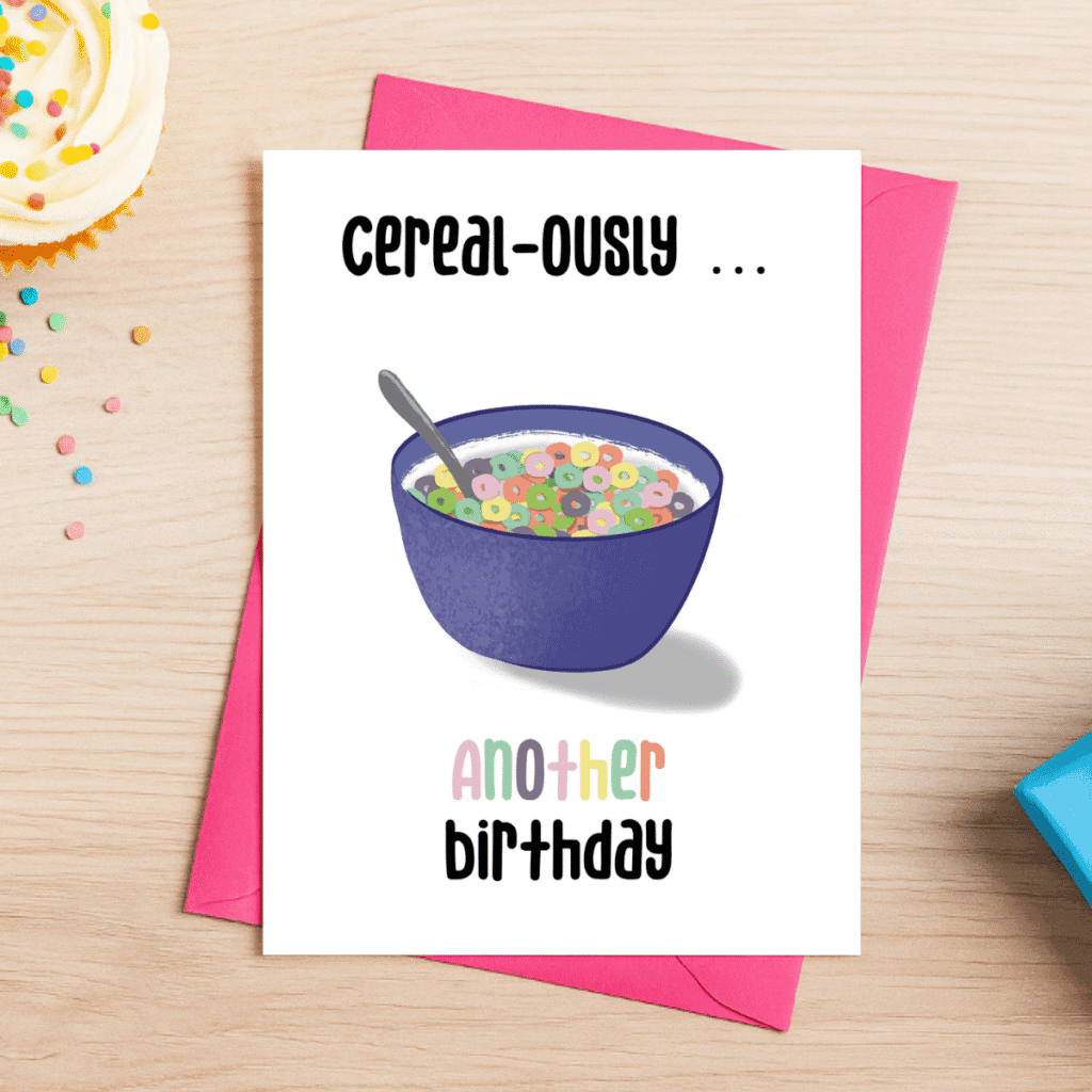 A pink envelope holds the Older Or Wiser Birthday Card 4, which reads: “Birthday Choices. Older ☐ Wiser ☐ You only get one choice.” It rests on a wooden table with a cupcake and confetti nearby.